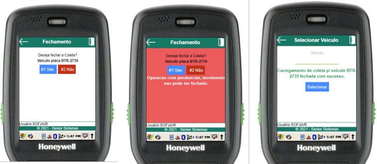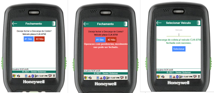 Para confirmar o fechamento, basta selecionar o botão “Sim” ou utilizar a tecla de atalho “1” no menu numérico. Caso a opção “Sim” seja escolhida e for possível fechar o carregamento de coleta, o usuário será redirecionado à tela de seleção de veículo, onde será exibida a mensagem de operação bem-sucedida, caso não seja possível, uma mensagem de erro será exibida. Se o botão “Não” for selecionado, o usuário será redirecionado para o menu de carregamento de coleta em questão.