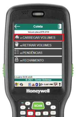 Para carregar os volumes de coleta no veículo, através do menu “Carregar Coleta”, deve-se selecionar a opção Carregar Volumes (atalho 1).