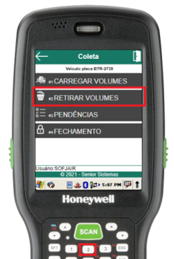 Caso algum volume seja carregado no veículo em questão de forma equivocada, a rotina de retirar “Retirar Volumes” pode ser utilizada através do segundo item do menu “Carregar Coleta”.