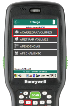 Para carregar os volumes de entrega no veículo, através do menu “Carregar Entrega”, deve-se selecionar a opção Carregar Volumes (atalho 1).