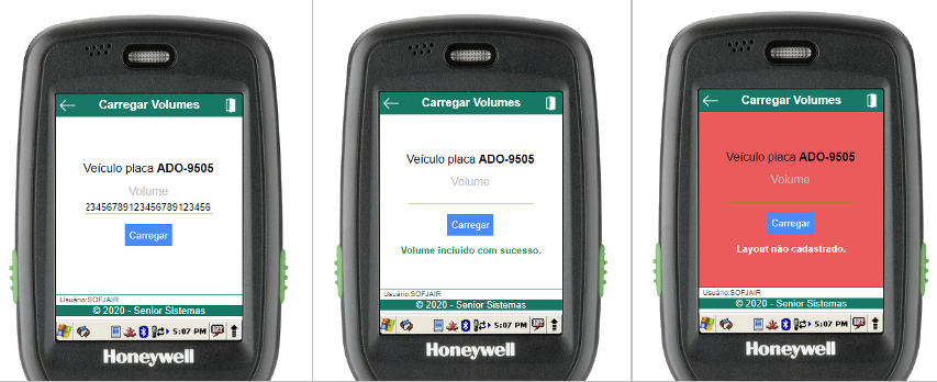 Dentro da rotina de carregamento, para iniciar o carregamento basta informar o código de barras do volume (através do scanner de código de barras ou digitação). Uma mensagem será exibida informando se a operação foi bem-sucedida, assim como um efeito sonoro específico.