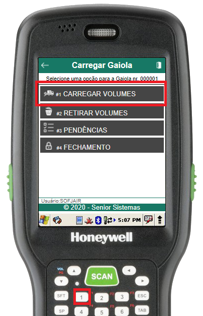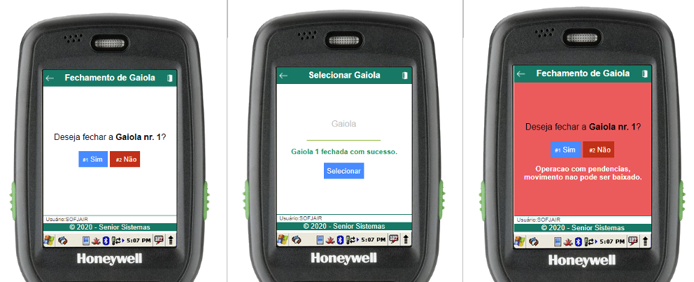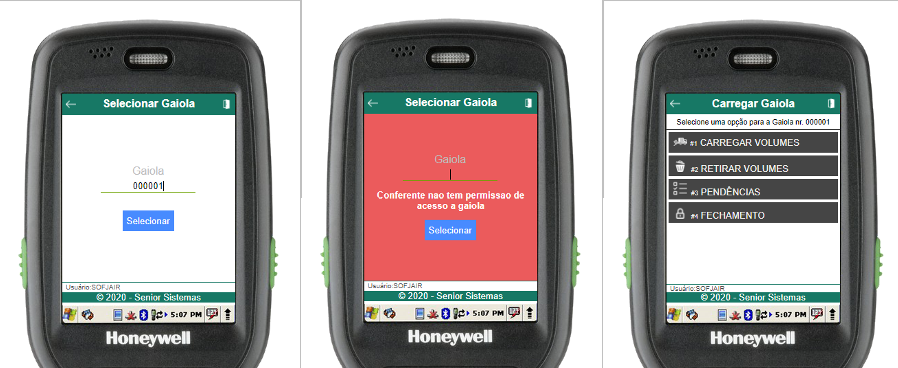 Na rotina de selecionar gaiola, informe o número da gaiola (através do scanner de código de barras ou digitação). Se a gaiola estiver aberta e cadastrada para o usuário em questão, o menu de carregamento da gaiola será aberto, caso contrário, um erro será exibido.
