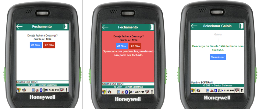 Na rotina de selecionar gaiola, basta informar o número da gaiola (através do scanner de código de barras ou digitação). Se a gaiola estiver aberta e cadastrada para o usuário em questão, o menu de descarga da gaiola será aberto, caso contrário, um erro será exibido.