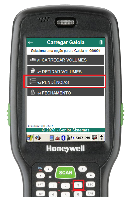 Para conferir os volumes pendentes em uma gaiola, deve-se acessar a rotina de pendências através do item 3 do menu de carregamento da gaiola.
