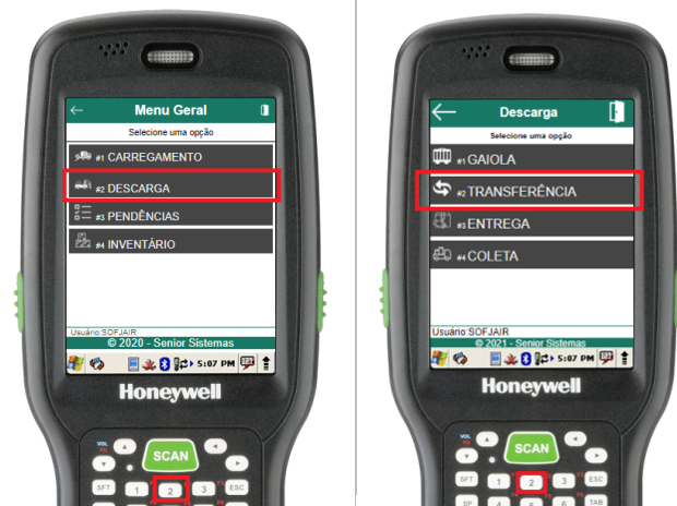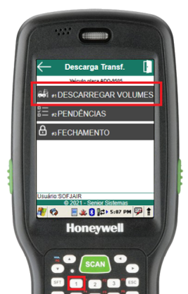 Para descarregar os volumes de transferência do veículo, através do menu “Descarga de Transferência”, deve-se selecionar a opção Descarregar Volumes (atalho 1).