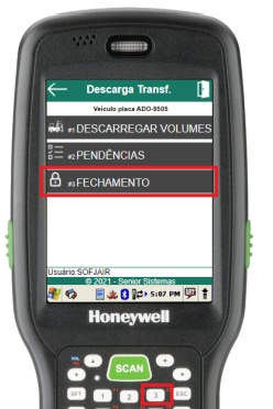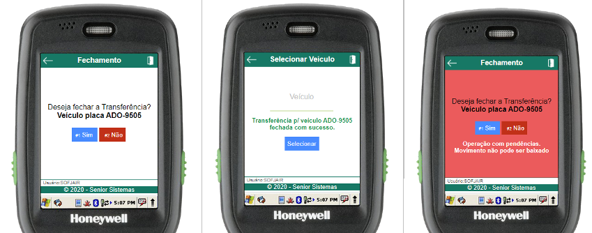 Para confirmar o fechamento, basta selecionar o botão “Sim” ou utilizar a tecla de atalho “4” no menu numérico. Caso a opção “Sim” seja escolhida e for possível fechar a transferência, o usuário será redirecionado à tela de seleção de veículo, onde será exibida a mensagem de operação bem-sucedida, caso não seja possível, uma mensagem de erro será exibida. Se o botão "Não" for selecionado, o usuário será redirecionado para o menu de carregamento da transferência em questão.