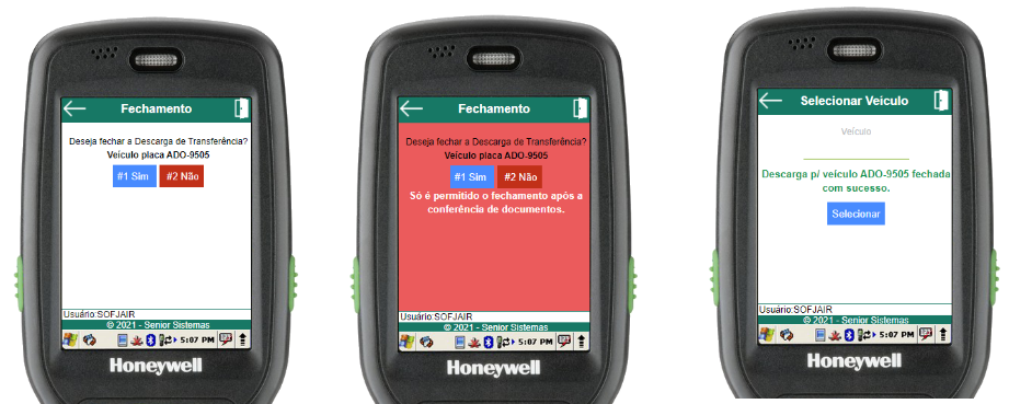 Para confirmar o fechamento, basta selecionar o botão “Sim” ou utilizar a tecla de atalho “1” no menu numérico. Caso a opção “Sim” seja escolhida e for possível fechar a descarga transferência, o usuário será redirecionado à tela de seleção de veículo, onde será exibida a mensagem de operação bem-sucedida, caso não seja possível, uma mensagem de erro será exibida. Se a opção “Não” for selecionada, o usuário será redirecionado para o menu de descarga da transferência em questão.