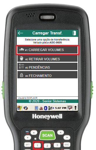 Para carregar os volumes de transferência no veículo, através do menu “Carregar Transferência”, deve-se selecionar a opção Carregar Volumes (atalho 1).