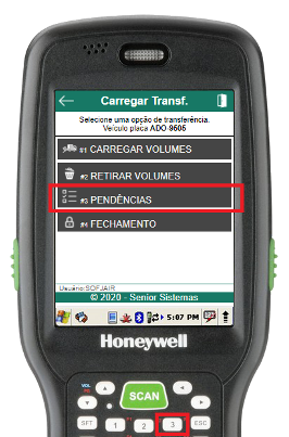 Para conferir os volumes pendentes em uma transferência, deve-se acessar a rotina de pendências através do item 3 do menu de carregamento da transferência.