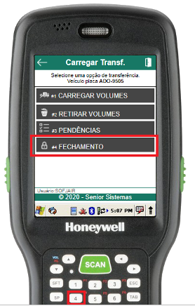 Ao não existirem mais pendências, o usuário poderá executar a rotina de fechamento do carregamento da transferência através do item 4 do menu de carregamento de transferência.