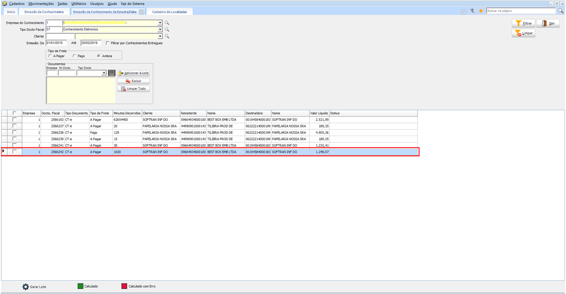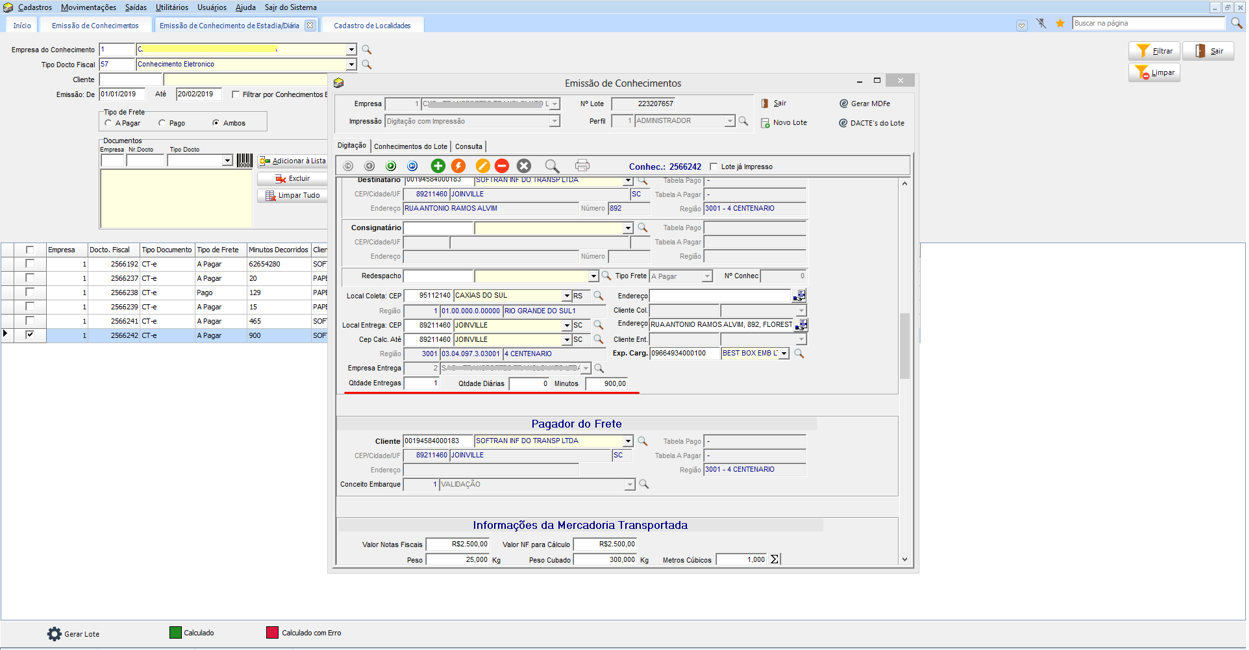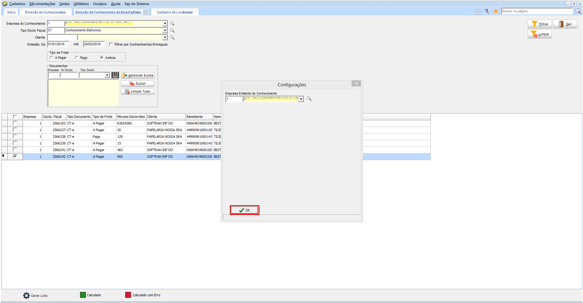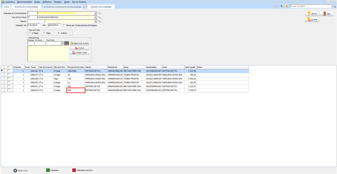 No processo, a rotina verifica se o cliente do documento tem uma Tabela de Diária ou se a Empresa está configurada com a Tabela de Diária. Sendo assim utilizamos essa tabela para calcular os minutos e gerar o valor do Frete. Então assim que calcular o Frete, os documentos cujos os valores forem maior que zero serão criados um Lote de Emissão, para que se faça a impressão do documento e geração do CT-eou NFS/NFSe.