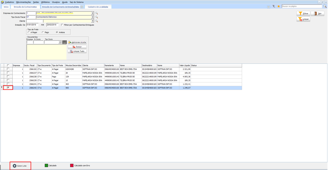 Marcar um ou mais conhecimentos e clicar em Gerar Lote.