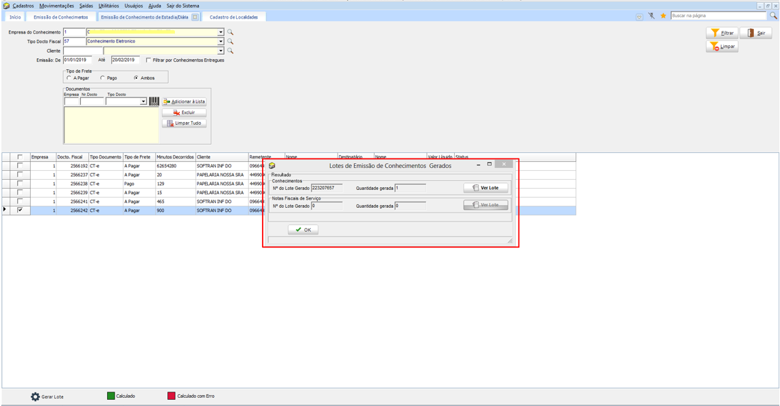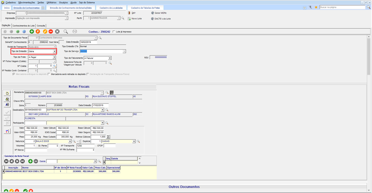 Na empresa emitente do conhecimento, virá por padrão preenchida a empresa que estiver vinculada ao usuário que está utilizando o sistema. Confirmado o processo, o lote de emissão do conhecimento de diária será gerado.