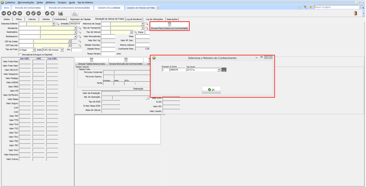 Para simular o cálculo, na guia Simulação de Cálculo de Fretes, seleciona o conhecimento gerado e informa o Tempo Parado (em minutos).