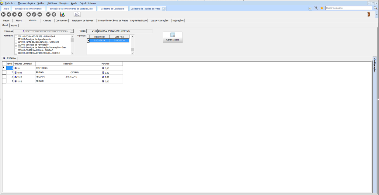 - No módulo CCE no menu Cadastros > Tabelas de Frete > Formatos de Tabela de Frete, deve ser cadastrado o formato da Tabela de Frete, onde o tipo deve ser igual a Tabela tempo (Min/Horas). Em Informações que Compõe a Tabela de Frete, a condição Se deve estar como QT.Minutos\horas e o Campo de Ref deve estar como Qt. Minuto(Minuto/hora). E em Cadastros > Tabelas de Frete > Tabelas de Frete Pré-Formatadas criar uma Tabela de Frete da diária com o novo formato.