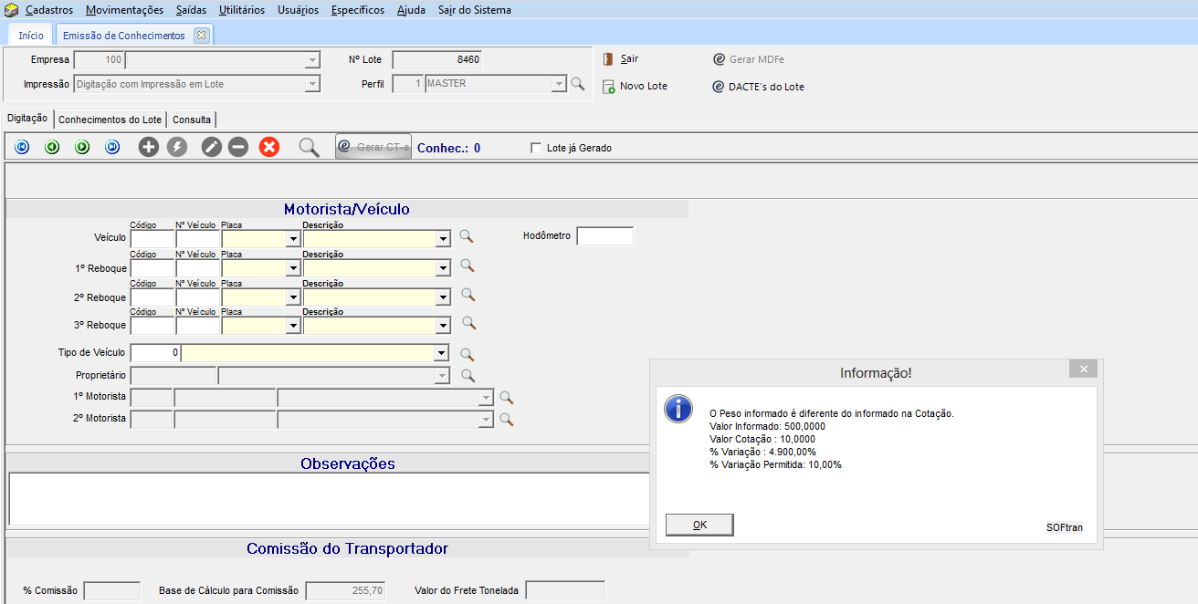 O sistema faz validação dos valores, quando o conhecimento exceder o valor cadastrado na cotação.