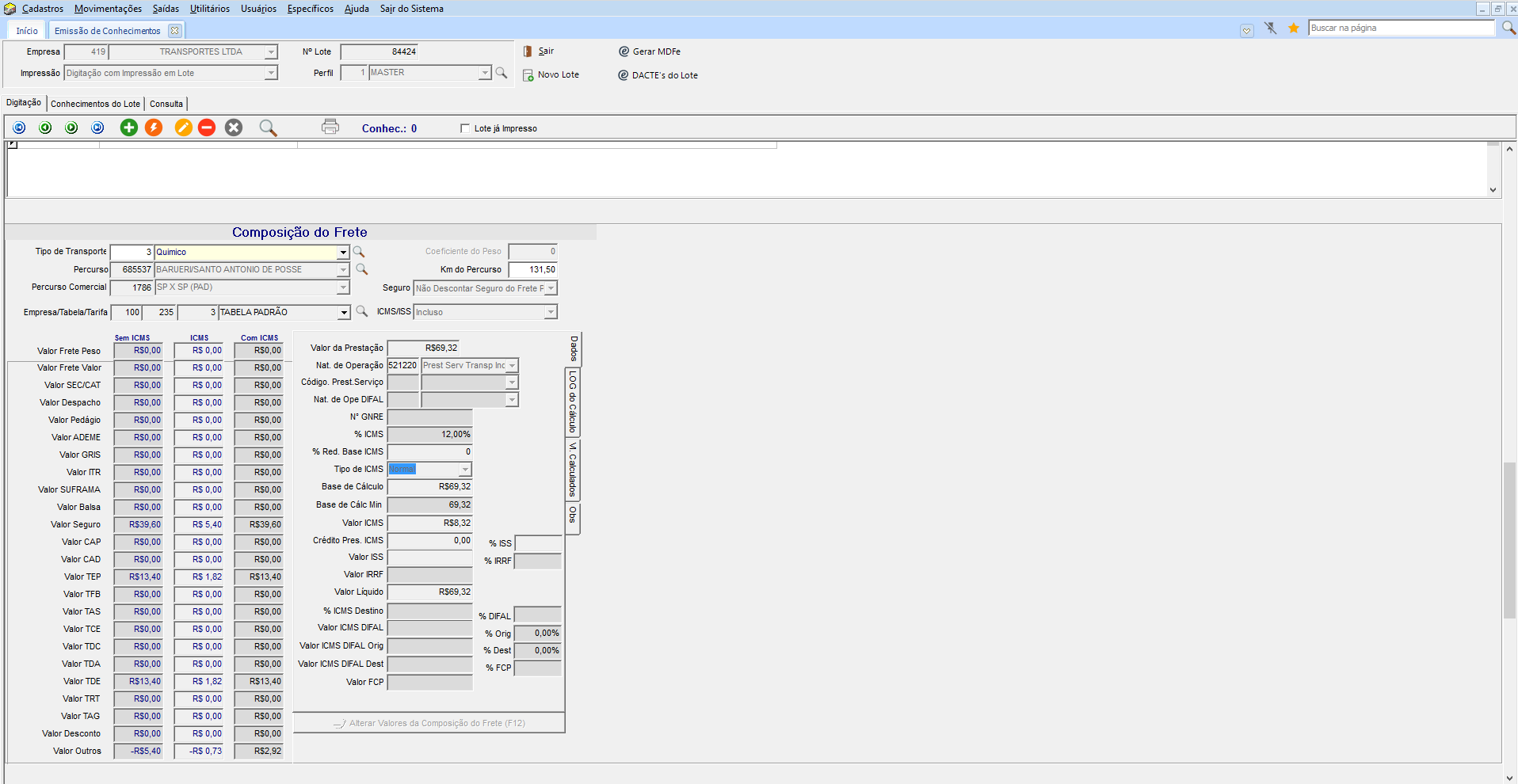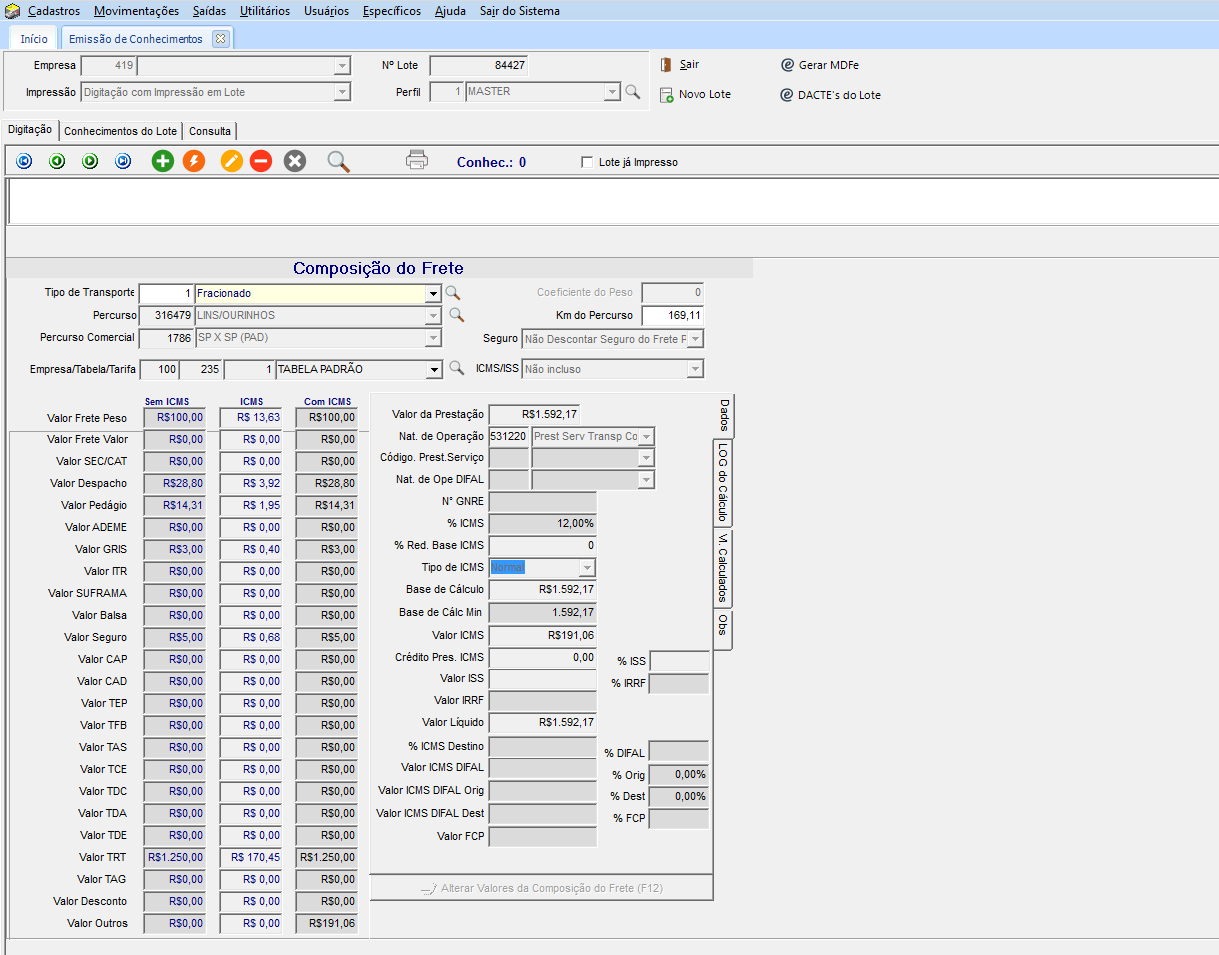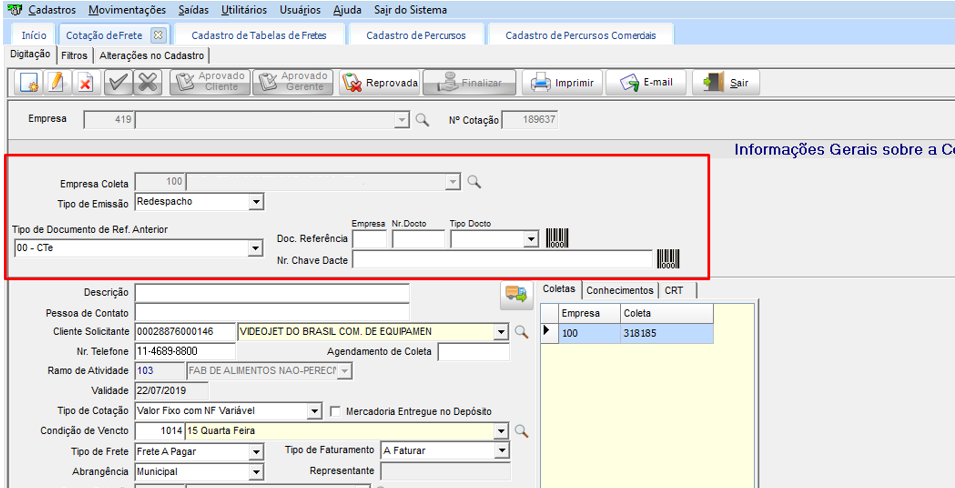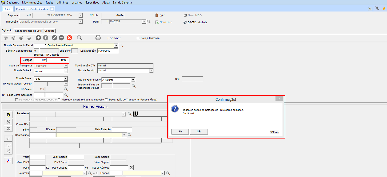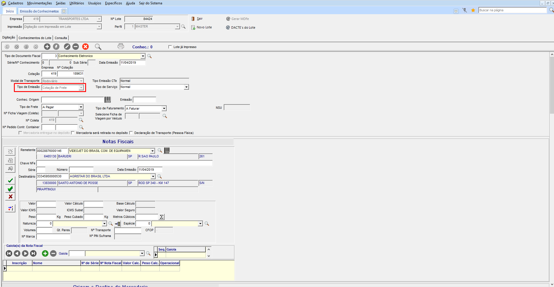 É necessário ter uma cotação de frete cadastrada, para posteriormente gerar a emissão do conhecimento para o tipo cotação de frete.