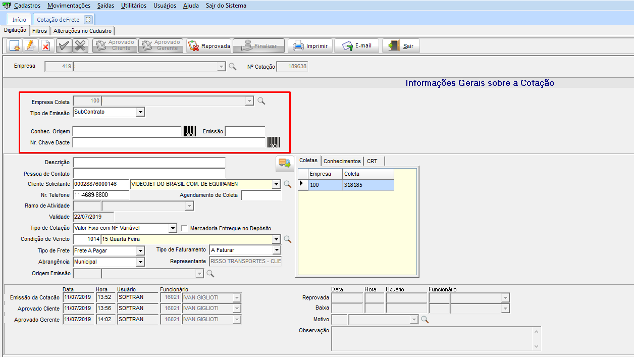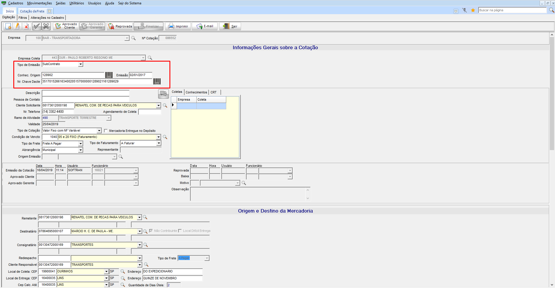 Da mesma forma, o sistema permite cadastrar uma cotação de subcontrato sem informar o CT-eorigem e o número da chave Dacte. Será obrigatório somente no preenchimento da emissão do conhecimento.