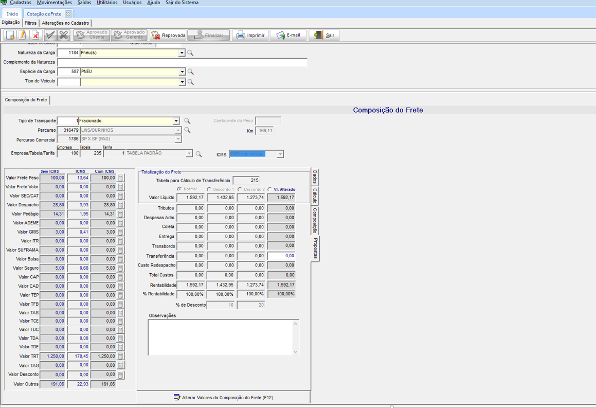 No módulo COM em Movimentações > Cotação de Frete, cadastre uma cotação com o Tipo de Emissão como o tipo Cotação de frete. Adicione alguns descontos na cotação e no conhecimento. Confira o valor total negociado.
