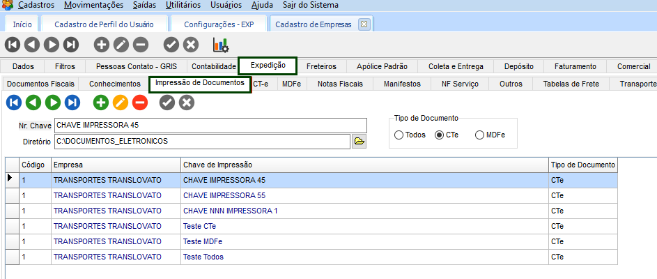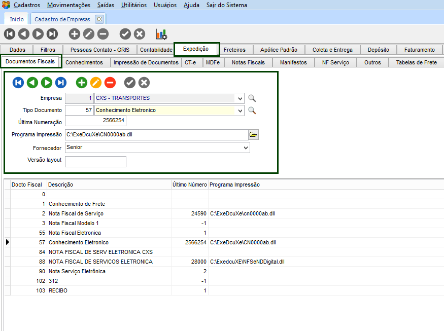 No módulo CFG, em Cadastros > Empresas > guia Expedição > Documentos Fiscais, cadastrar os documentos fiscais que serão utilizados na impressão do documento. Os principais campos a serem preenchidos, são: