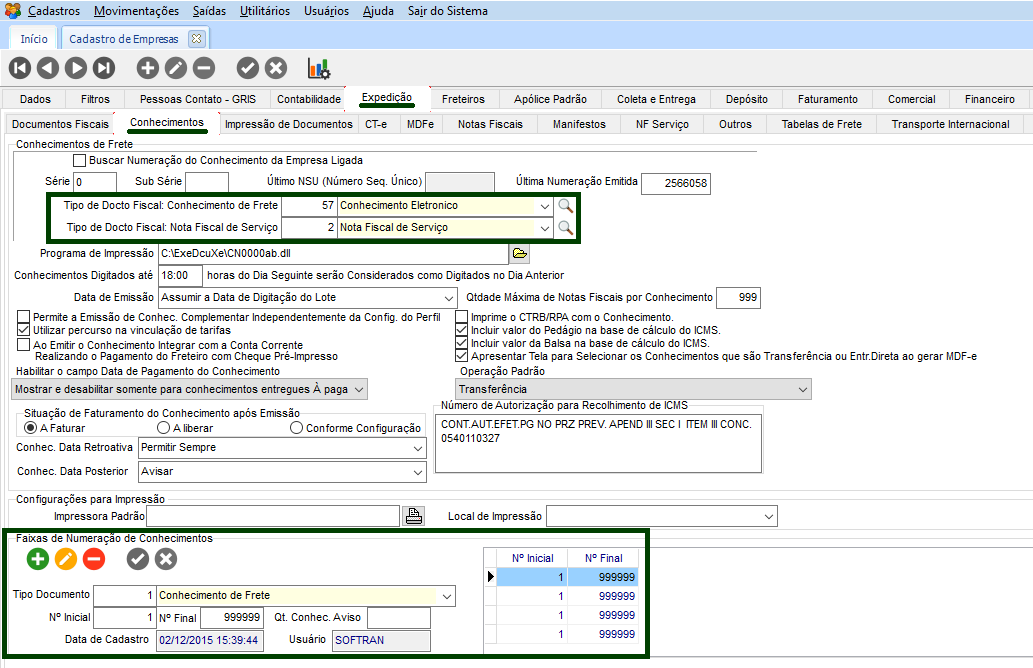 - Faixa de Numeração de Conhecimentos: definição da sequência automática da numeração de conhecimento/nota fiscal, de acordo com o tipo de documento informado no cadastro.