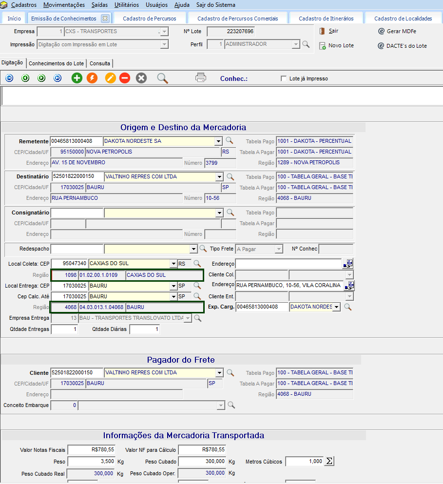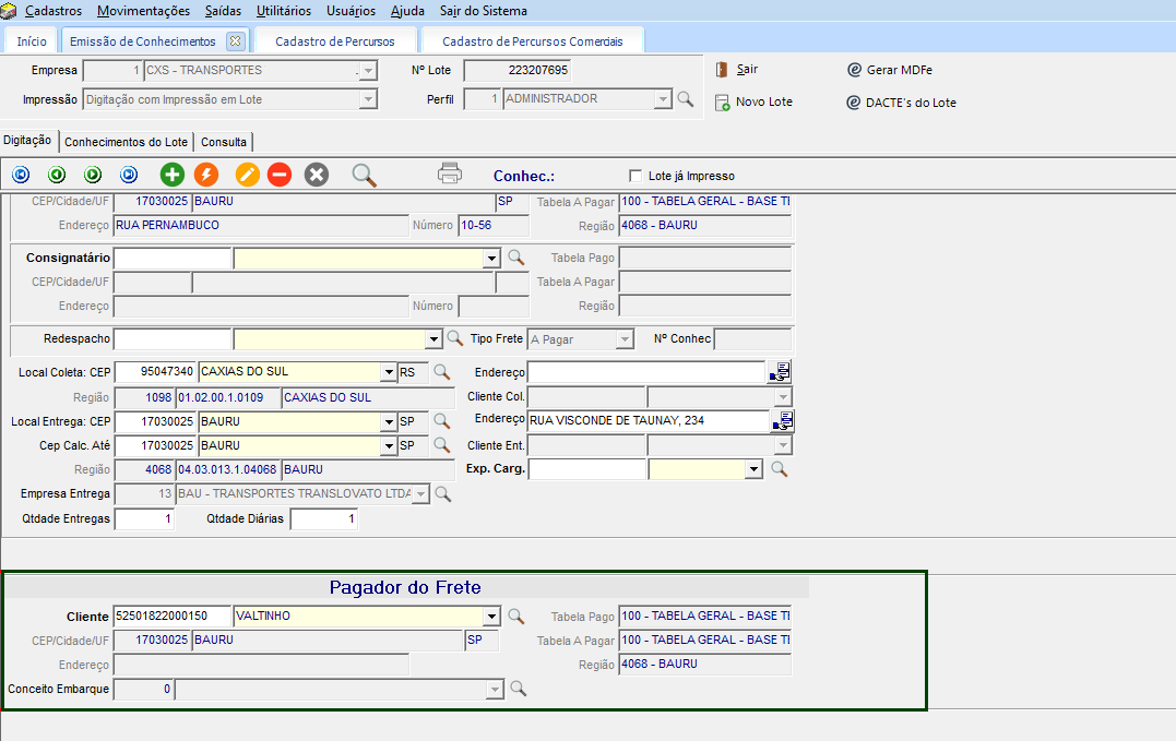 No quadro Pagador do Frete apresenta os dados do Destinatário, pois o tipo de frete definido ficou com o tipo a pagar.