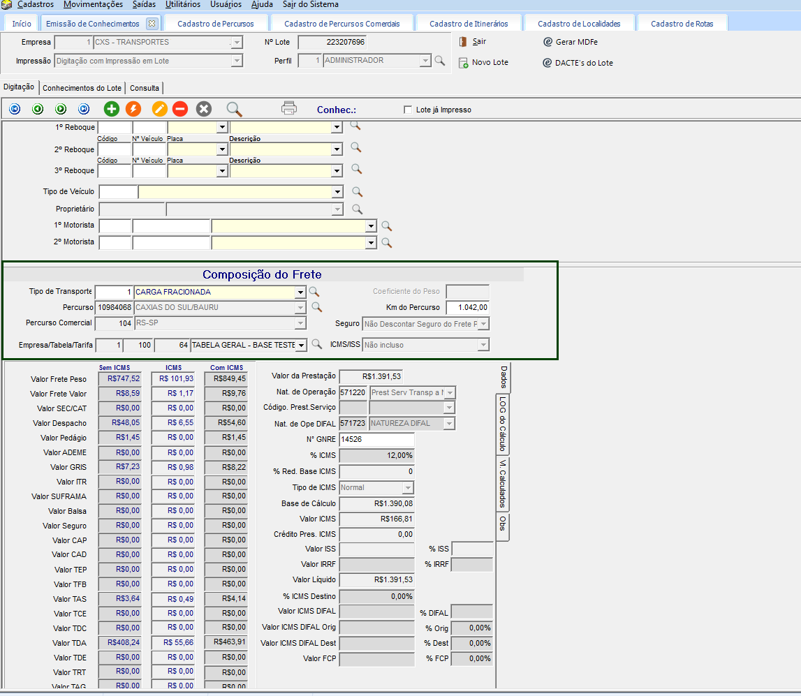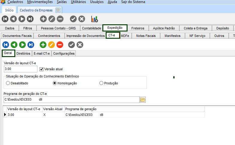 - CFG > Cadastros > Empresas > guia Expedição > guia Tabelas de Frete