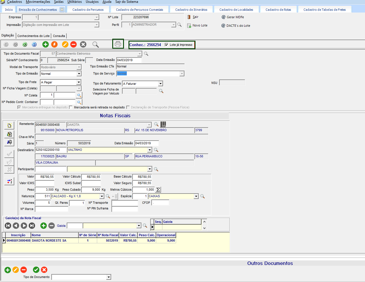 No quadro de Notas Fiscais, informado os principais campos que são: Remetente, Destinatário, Valor, Peso, Natureza e Espécie.