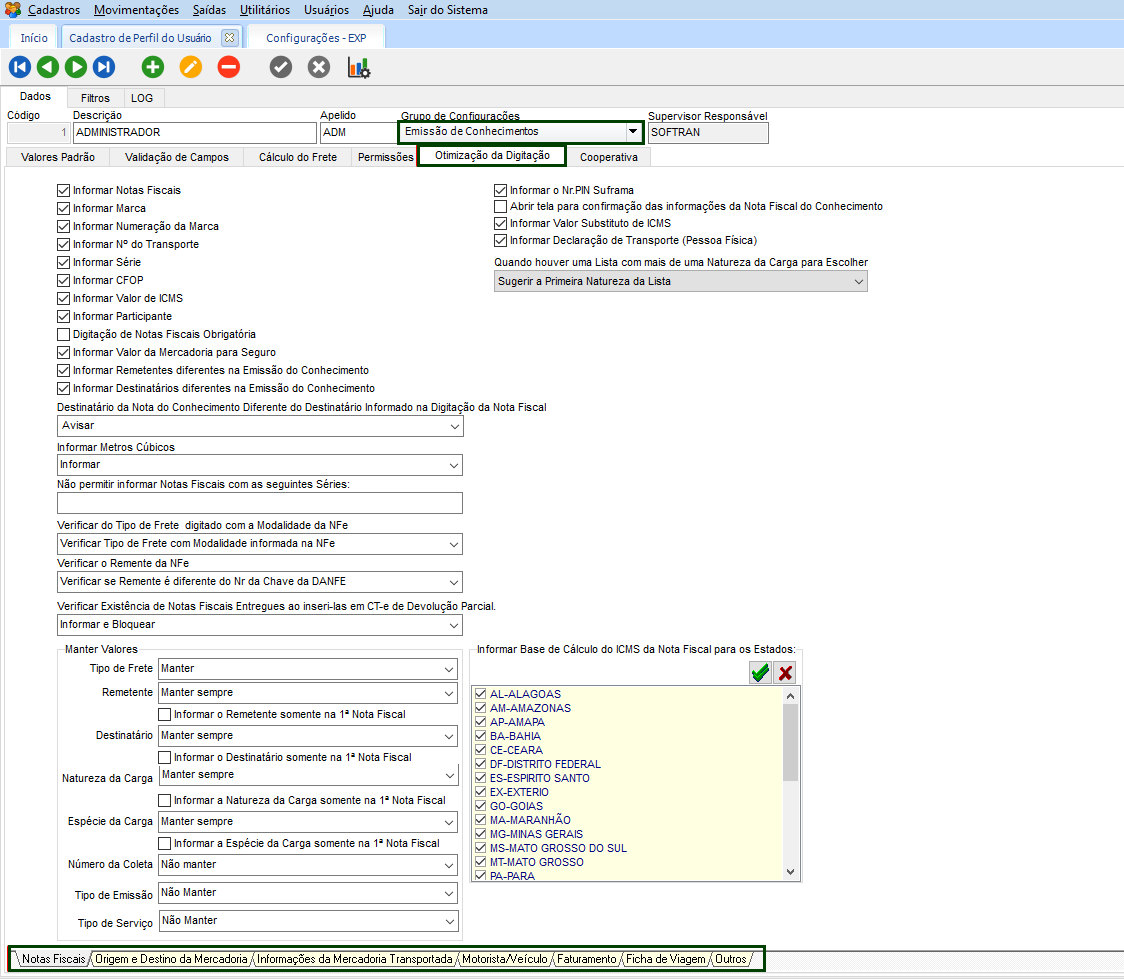 Em Cadastros > Usuários > Perfil do Usuário, no grupo de configurações ‘Emissão de Conhecimentos’, guia Otimização da Digitação. Nas subguias existentes nesta tela, pode certificar quais os campos serão obrigatórios o preenchimento, bem como permitir que o cursor passe por eles durante a digitação, entre outros.