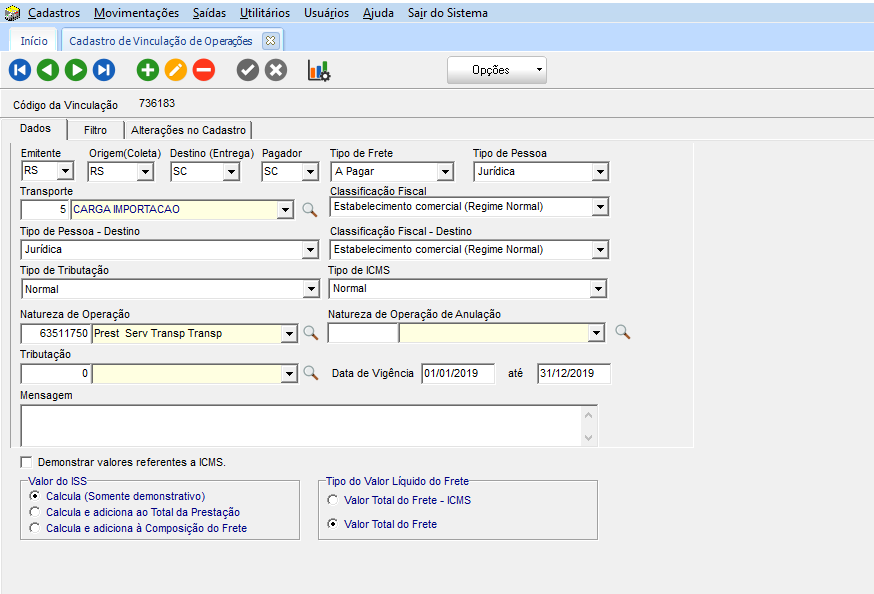 No módulo EXP, em Cadastros > Cadastros Gerais > Vinculação de Operações, com base nos dados das UF do Emitente/Destinatário/Pagador, tipo de contribuinte, ramos de atividade do remetente/destinatário, encontraremos a vinculação da natureza de operação, onde serão localizadas as CFOPs. Com base na CFOP, será calculado o ICMS ou ISS conforme o tipo de documento fiscal e conforme o tipo de vinculação de operação.