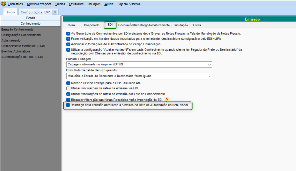 Para configurar essa restrição, acessar no módulo CFG, > Utilitários > Configurações > Utilitários > Configurações > TMS > EXP – Expedição > guia Conhecimento e a seguir, guia Emissão Conhecimento e na guia EDI ativar a opção Restringir data de emissão anteriores a 6 meses da Data de Autorização da Nota Fiscal :
