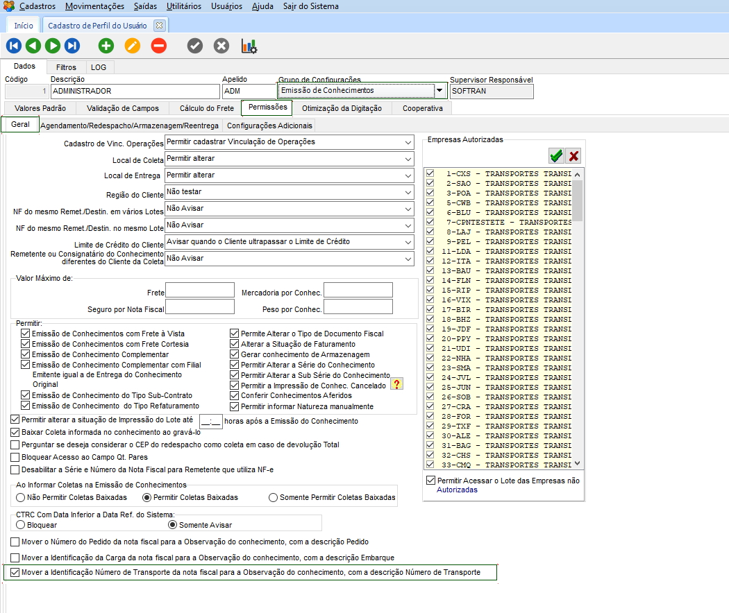 No módulo CFG, em Cadastros > Usuários > Perfil do Usuário, no grupo de configurações: Emissão de Conhecimentos, guia Permissões > Geral, marque a opção Mover a identificação Número de Transporte da nota fiscal para a Observação do conhecimento, com a descrição Número de Transporte.