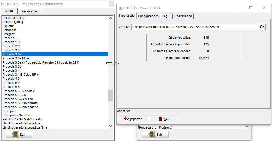 No módulo EXP, em Movimentações > EDI > Importação de Notas Fiscais, selecionado o arquivo Proceda 3.0a. Selecione o arquivo com as notas a serem importadas, e clique em Importar para que o processo seja realizado.