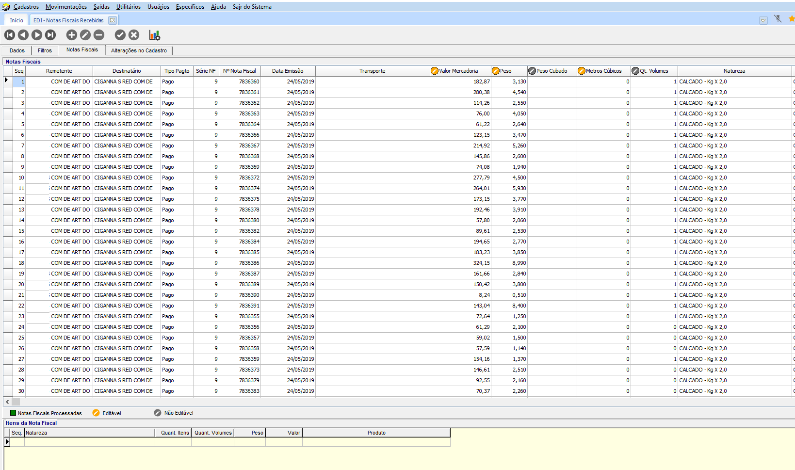 Para consultar as notas importadas, verificar em Movimentações > EDI > Notas Fiscais Recebidas, guia Notas Fiscais.