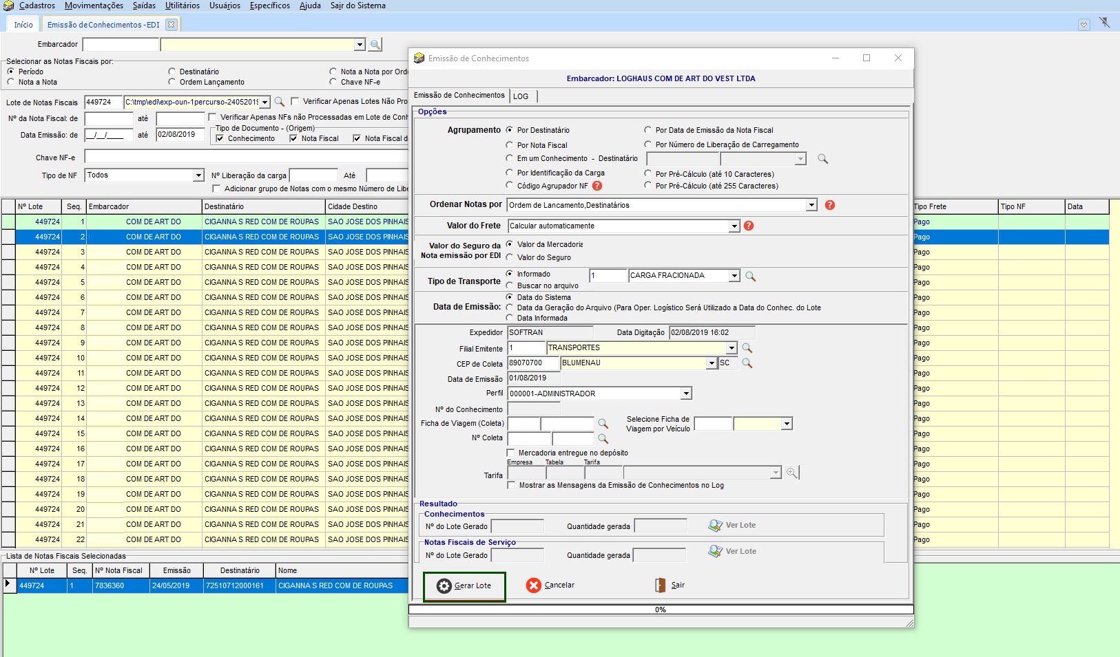 Em Movimentações > EDI > Emissão > Conhecimentos, selecionado o mesmo lote que foi importado anteriormente, e filtrar todas as notas importadas. Adicionar na lista as notas que deseja gerar o lote do conhecimento. Clicar em Iniciar e em seguida clique em Gerar o Lote.