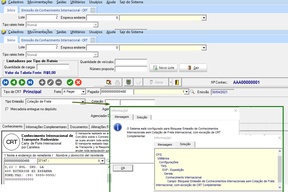 O bloqueio da emissão de Conhecimento Internacional, é realizad quando não informado em tela uma cotação de frete internacional. Por meio de configuração é possível verificar que se tenha controle de quem tem permissão ou não de executar o processo.