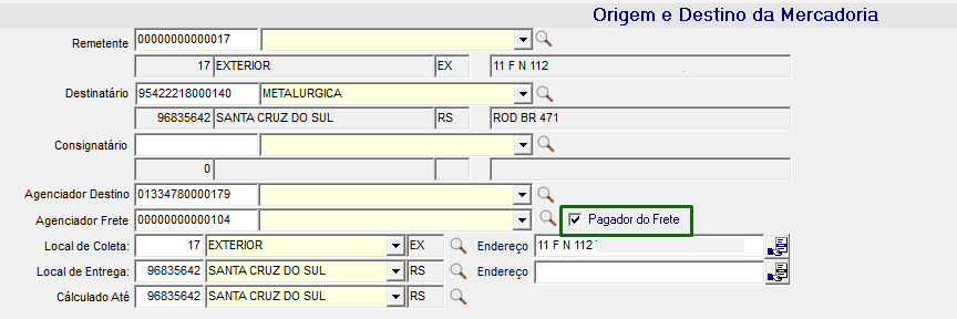 No quadro de Origem e Destino da Mercadoria, temos a opção Pagador do Frete ao lado do campo Agenciador da Carga, onde: