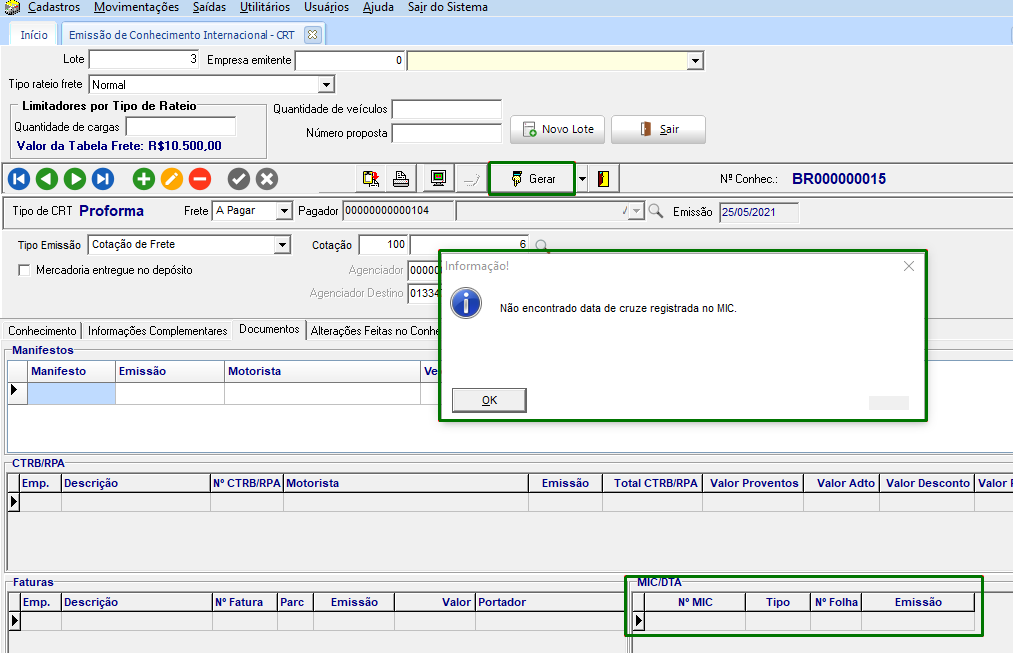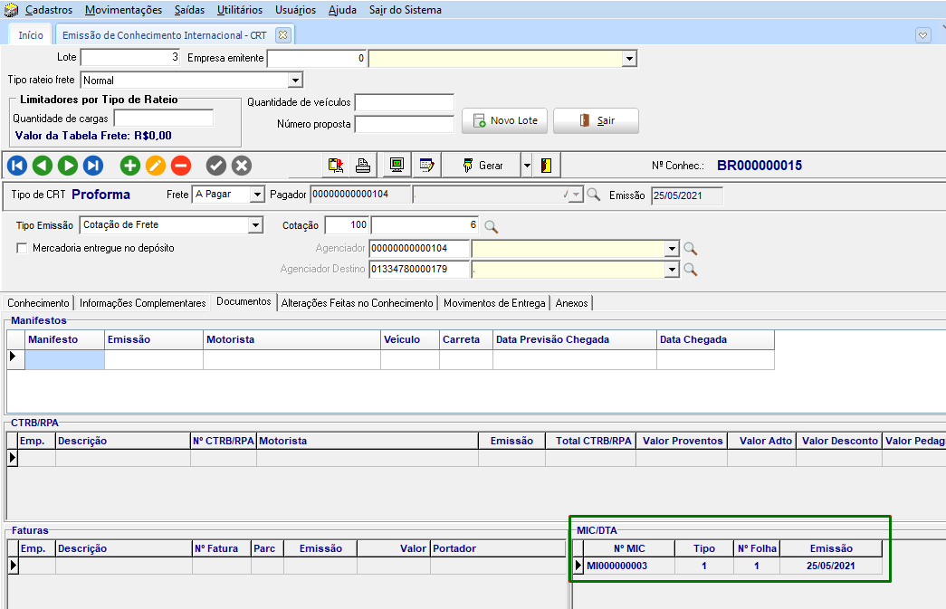 Quando tiver o MIC informado no CRT Proforma, o sistema permite gerar o CRT de Faturamento.