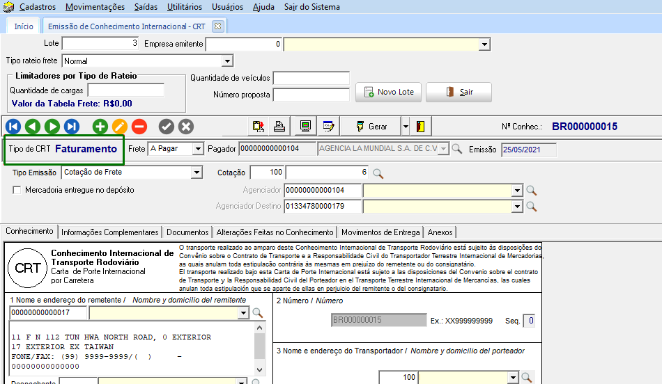 Quando estiver informada, o sistema permite gerar o CRT Faturamento.