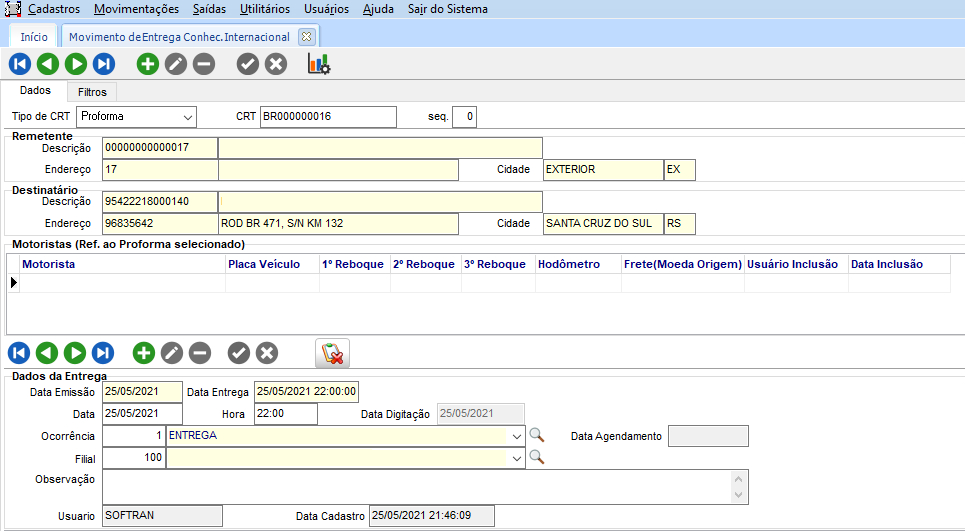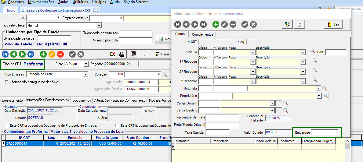 Deste CRT Principal, foi gerado o Proforma. Onde, este terá as mesmas informações do CRT Principal.