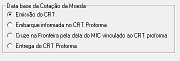 Quando marcada esta configuração, o sistema verifica a Data de Embarque informada no CRT Proforma, como base de cotação da moeda. Caso não possua a informação, no momento da geração do CRT de Faturamento, o sistema irá bloquear o processo e informar o usuário.