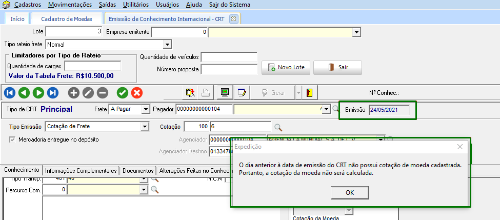 - A moeda e cotação dos valores na Cotação de Frete, deve ser igual a Cotação da moeda e valores no CRT (guia conhecimento, campos Cotação de Moeda, Moeda (tipo, ex: RS, USD) .