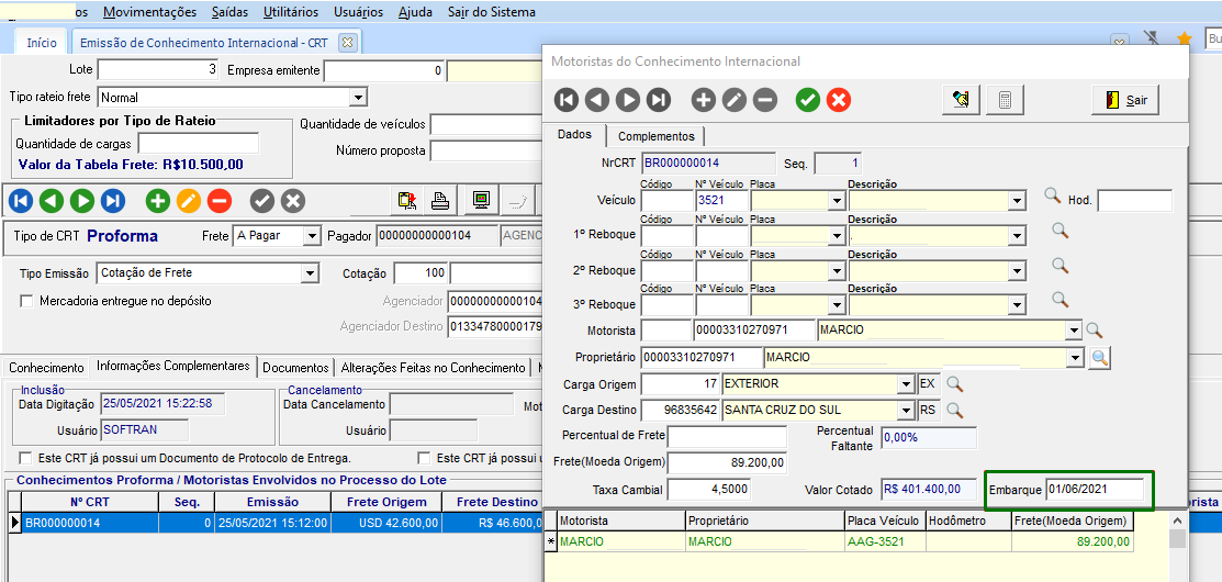 - Data de Embarque informada no CRT Proforma (quando tiver mais de um CRT Proforma, tomar do primeiro que tiver data ou do que tiver data mais antiga)