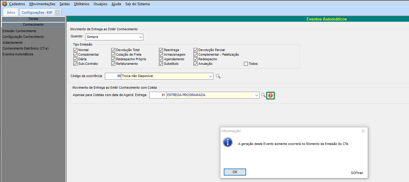 Ao emitir um CT-e serão gerados Movimentos de Entrega de maneira automática com base nas configurações disponíveis no sistema.
