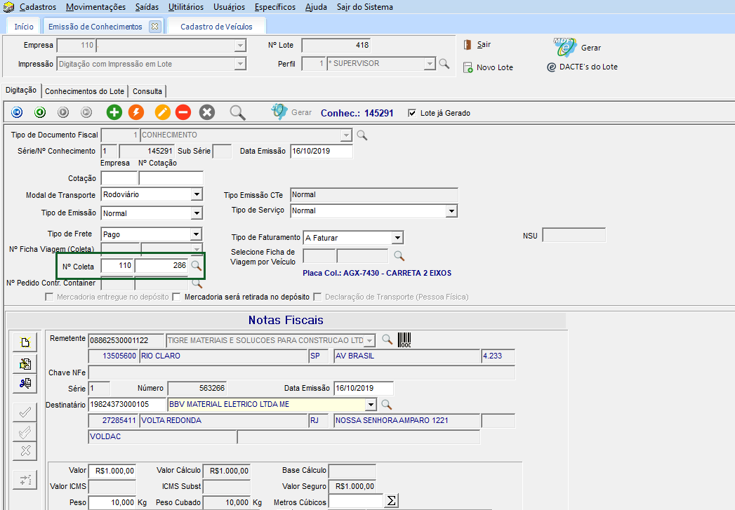 No módulo EXP, em Movimentações > Conhecimentos > Emissão, cadastrado um conhecimento, adicionado a mesma coleta que tem preenchido a data de agendamento. Clique em Imprimir.