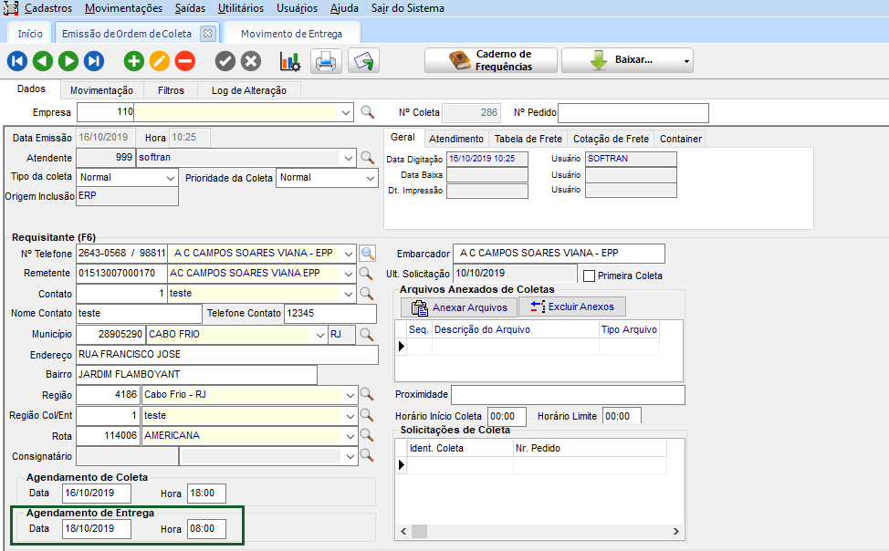 O sistema gerou o movimento de entrega de acordo com a configuração e a data de agendamento da coleta foi registrada na data de agendamento do movimento de entrega.