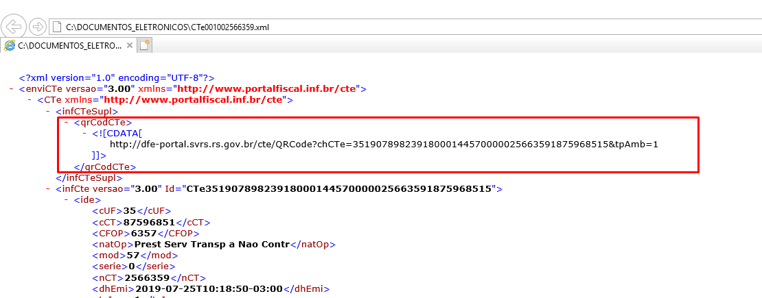 Ao conferir o XML, o sistema apresenta a tag qrCodCTecom as informações que foram preenchidas na configuração da empresa.