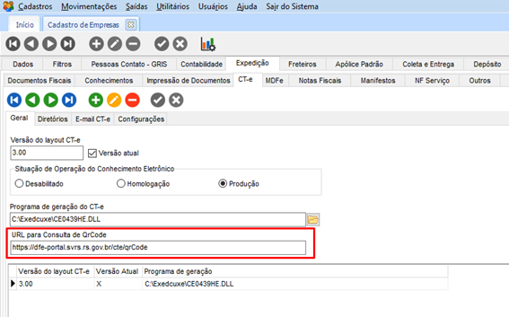 No módulo CFG, em Cadastros > Empresas, guia Expedição > CT-e > Geral, incluído o campo URL para Consulta de QRCode. Permitindo o usuário configurar de acordo com a necessidade.
