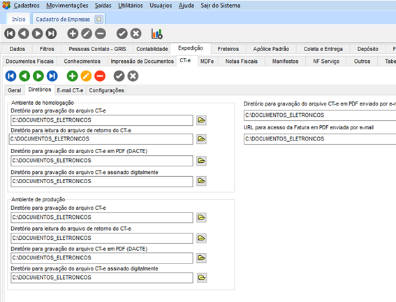 Na guia CT-e, deve estar cadastrado os diretórios onde serão salvos os XMLs.