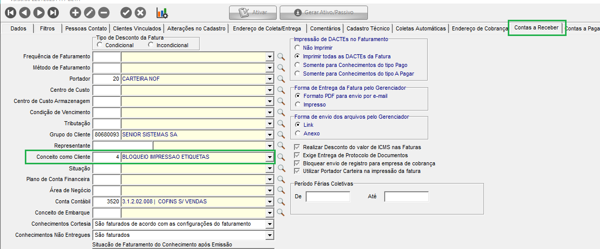 Na tela de Cadastro de Clientes e Fornecedores, na guia Contas a Receber, é exibido o campo Conceito como Cliente, que busca o cadastro que tem a configuração do bloqueio de etiquetas.